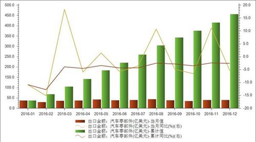 以下為2016年1月至12月我國(guó)汽車零部件出口金額統(tǒng)計(jì):